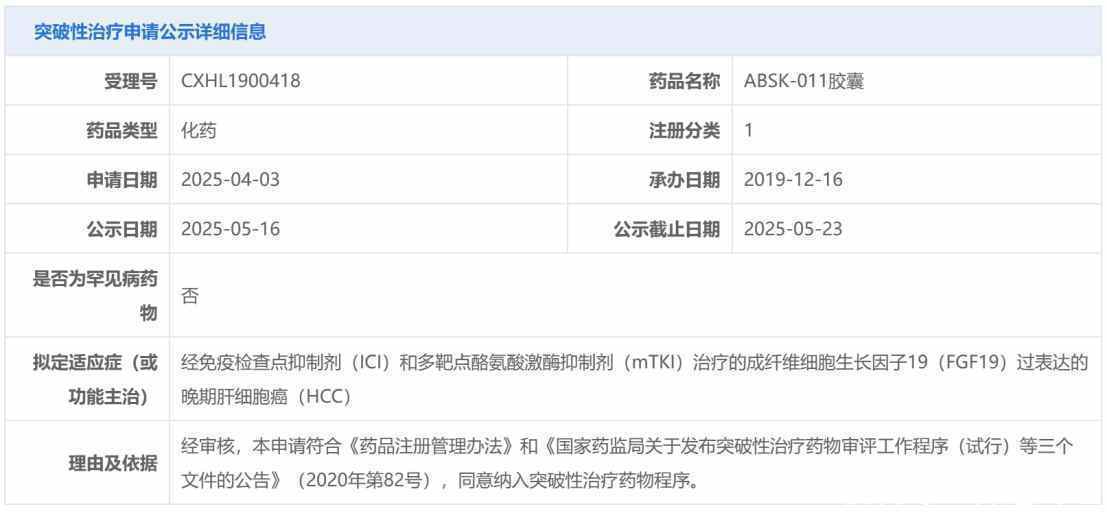 作为全球首个针对FGF19/FGFR4信号通路异常激活的小分子抑制剂,ABSK-011自2023年ESMO年会上首次亮相以来,便凭借显著的疗效和相比其他FGFR4靶向药更具依从性和经济性优势,广受全球业界和市场关注。如今ABSK-011在国内顺利获纳入突破性治疗品种,也预示着其成为“超十亿美元分子”的确定性正进一步提高,并存在潜在的重磅BD价值。
